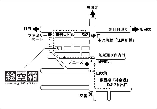 (有楽町線「江戸川橋」駅 徒歩2分/東西線「神楽坂」駅 徒歩9分) (http://esorabako.com/access.html)